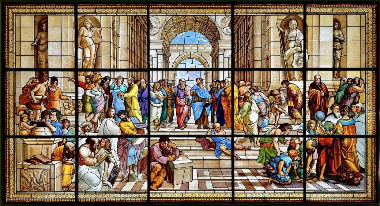 Phiên bản kính màu lớn đầu tiên trên thế giới chuyển thể từ kiệt tác Phục Hưng của Raphael (1509–1511). Tác phẩm tại Bảo tàng cao 3,2 m, rộng 6 m, do các nghệ nhân Việt Nam thực hiện trong 3,5 năm với hàng nghìn miếng kính được vẽ bằng nhiều lớp men trong suốt nhập tư Pháp và tôi nhiều lần ở nhiệt độ 800 độ C.